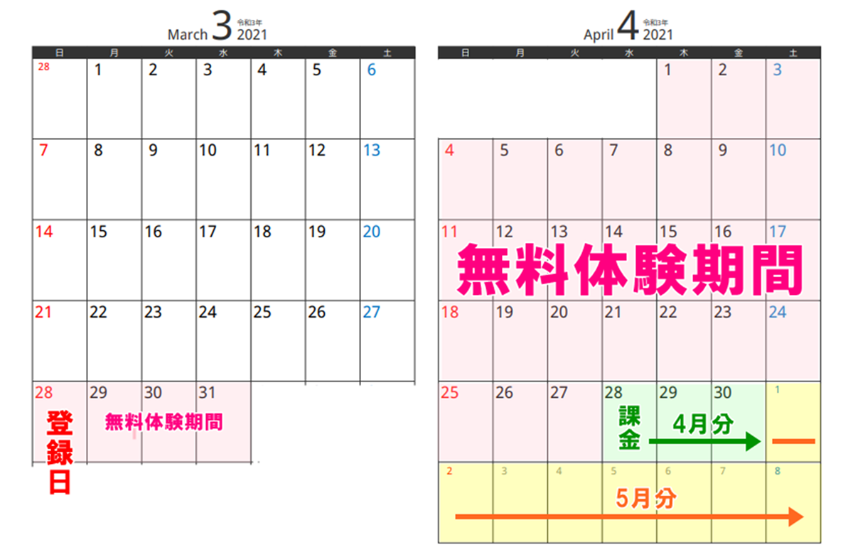 下図の例が理想的です。無料トライアル後、引き続き利用する場合、4月1日から4月分の利用料が発生するので、損はありません。